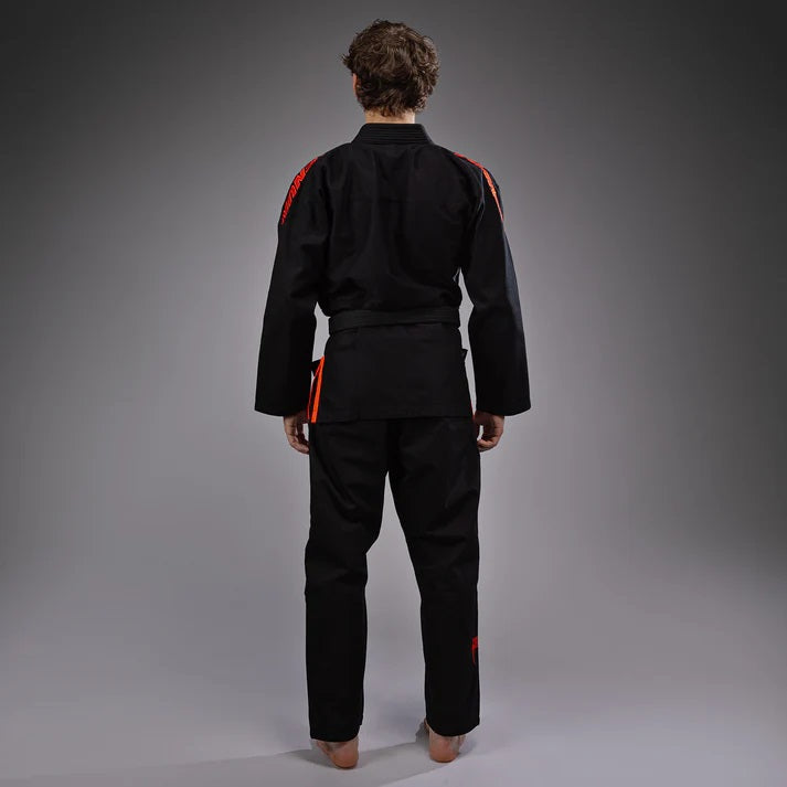 The striking design of the Venum Challenger XT Gi incorporates the Venum fangs, with branding in red at the shoulders, waist and ankle.